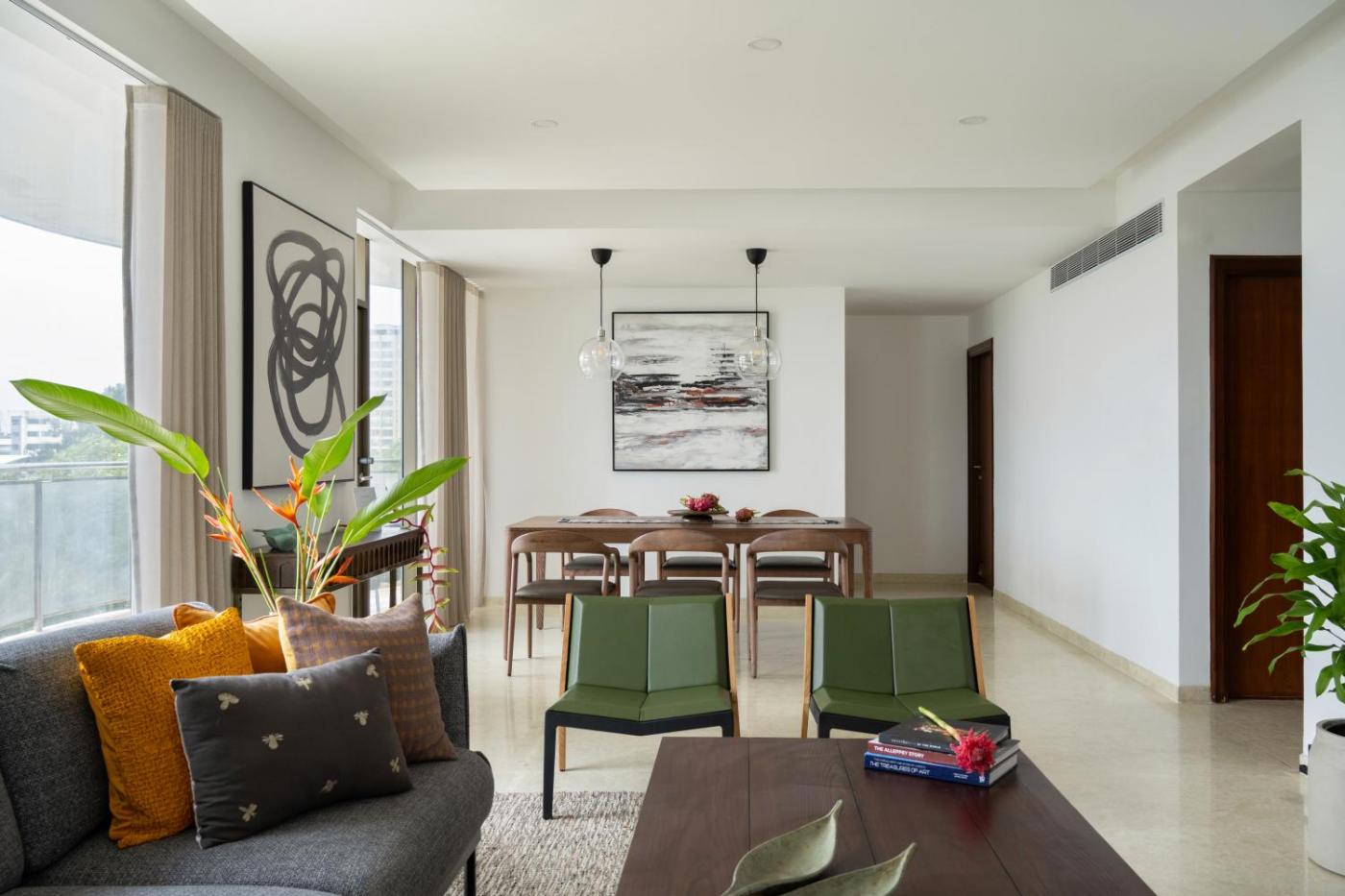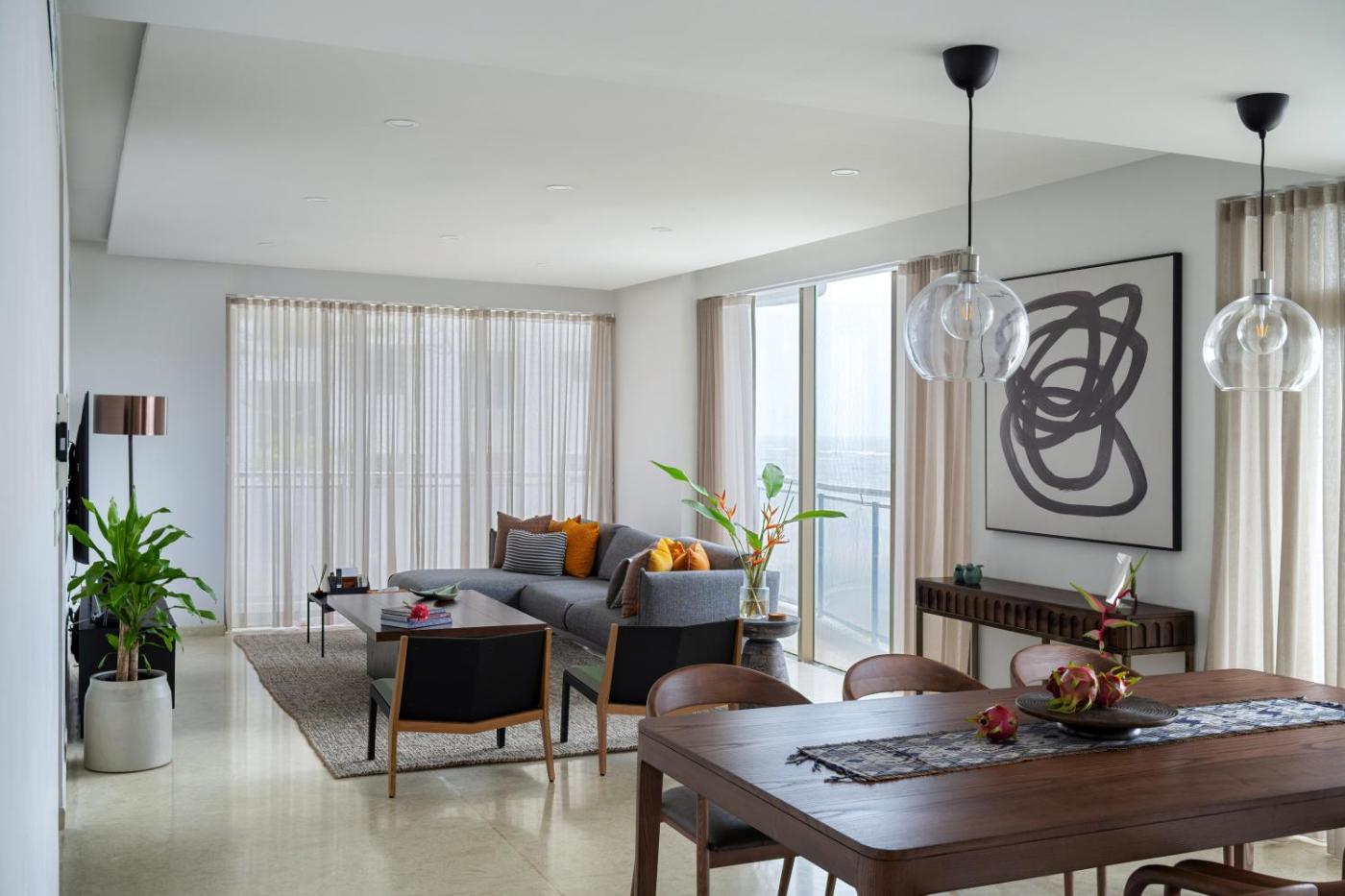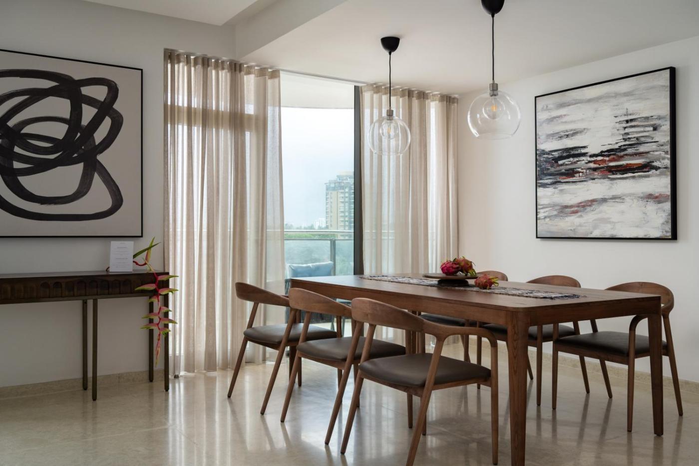 Three-Bedroom Premium Apartment with Balcony. This spacious apartment includes 1 living room, 3 separate bedrooms and 4 bathrooms with a shower and a hairdryer. In the well-equipped kitchen, guests will find a stovetop, a refrigerator, kitchenware and a microwave. The air-conditioned apartment offers a flat-screen TV, a washing machine, a dining area, a wardrobe as well as sea views. The unit has 4 beds.